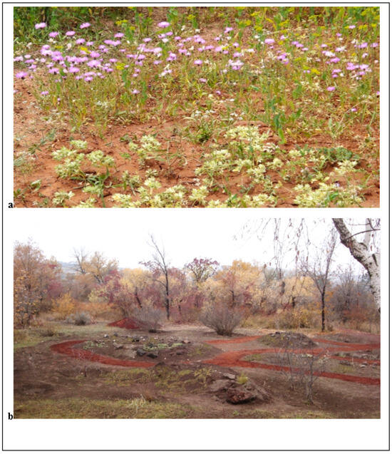 Exhibition fragments at the Yerevan Botanical Garden: (a) “Flora of Gypsiferous Red Clays”, featuring Actinolema macrolema and Amberboa moschata; (b) “Flora of Semi-Deserts and Foothills of the Ararat Valley” exhibition.