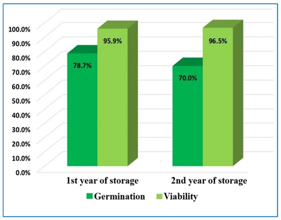 Amberboa moschata is an annual plant 20–70 cm tall, with an erect, weakly branched stem and a thin root. After autumn sowing in the Yerevan Botanical Garden in open ground, A. moschata seed germination was observed during the following spring in first ten days of March. The seeds should be sown at a shallow depth of 4–6 mm, since in addition to moisture, A. moschata seeds require sufficient light to germinate. When seeds are sown in spring, seedlings appear in 2–3 weeks. Autumn sowing is more effective in terms of seed germination than spring sowing. Seed field germination is about 75–90%. In plants of the Asteraceae family, the seeds have a fully developed embryo and are characterized by the absence of dormancy or shallow physiological dormancy; the seeds of more than 60% of species of the Asteraceae family have an accelerated type of germination [22,23]. As a result of determining the laboratory germination and viability of A. moschata seeds in the first and second years of storage, fairly high indicators were obtained (Table 2, Figure 3). The beginning of germination in laboratory conditions is observed 10–12 days after seed placement and continues for about 20–25 days. During storage, A. moschata seeds retain their germination capacity for an average of six-seven years.