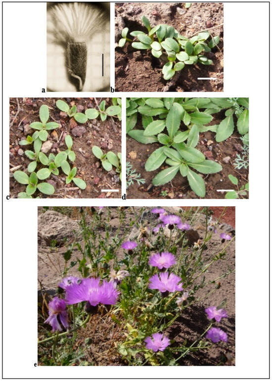 Amberboa moschata: seed (a), scale bar 3 mm; seedlings at cotyledon stage (b), scale bar 1 cm; seedlings at the stage of first leaves (c), scale bar 1 cm; rosettes (d), scale bar 1 cm; and in flowering (e).