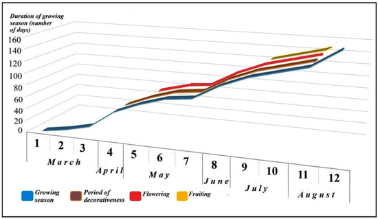Phenological stages in the development and decorativeness period of Amberboa moschata. 1—emergence of seedlings, 2—appearance of first pair of leaves, 3—beginning of rosette growing, 4—formation of plant vegetative habit, 5—beginning of budding phase, 6—beginning of flowering (10%), 7, 8, 9—mass flowering, 10—beginning of fruit ripening, 11—mass ripening of fruits, 12—end of fruiting and growing season.