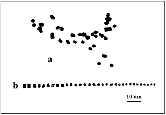 Pollen fertility is a significant determinant of whether in a population there will be enough regeneration through sexual reproduction to ensure the survival of that species; it is very important in fruit and seed production in flowering plants. Pollen plays an important role in the formation of the hereditary properties of seeds [31]. The pollen fertility knowledge for any plant species is essential for plant breeders and commercial growers. Fertile pollen is that pollen which, under favorable conditions, after falling on the stigmas of the same plant or other plants of the same species, the pollen tubes germinate and the male gametes enter the embryo sac, producing fertilization. For the successful production of fruits and seeds of flowering plants, information on pollen fertility is required, which can be determined using in vitro tests. How important information about pollen fertility is for obtaining productive offspring can be seen from our previous works and from literary sources [32,33,34,35,36,37,38]. In addition to pollen fertility, the size of pollen grains plays an important role. According to the morphological heterogeneity of pollen, one can assume failures in microsporogenesis, which can lead to unsuccessful seed formation.
