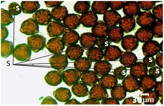 Pollen fertility of Amberboa moschata specimens cultivated in the Yerevan Botanical Garden, S—sterile pollen grains. Scale bar 30 µm.