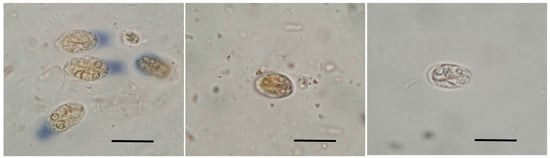 Sample collection was performed by zookeepers early in the morning during routine cleaning and environmental maintenance procedures; no direct handling of the animals occurred during the collection of samples used in this study. Care was taken to avoid contamination with soil or plant debris. For the porcupine species, animal groups were formed by two individuals and fecal samples in each sampling event were obtained from both of them. In the case of the naked mole rats, which were housed as a colony of 11 individuals, pooled fecal boluses were collected from the “toilet chamber” of the colony. Samples were stored in clean, new plastic containers and transported to the laboratory within 1–3 h. after collection for immediate processing. Fecal concentrates were prepared using the sodium acetate-ether stool concentration technique []. Briefly, a small amount of each sample (2–3 g for the porcupine samples, 10–15 fecal pellets for the naked mole rats) was homogenized in 30 mL of acetate-acetic acid buffer (1.5% sodium acetate and 0.36% acetic acid in distilled water), then filtered through a metal sieve. The filtrate was mixed 1:1 with diethyl ether, vortexed for 30 s, and centrifuged at 1500 rpm for 2 min. The resulting aqueous sediment was examined microscopically on temporary slides, either unstained or stained with Lugol’s iodine. Cysts were photographed and measured using an Olympus DP20 camera mounted on an Olympus BX51 microscope (Olympus, Tokyo, Japan).