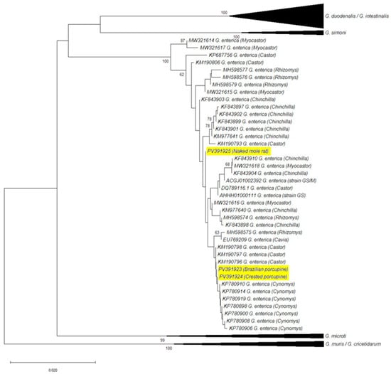 No genetic data are currently available for comparison in the case of the Brazilian porcupine and the naked mole rat. In Brazilian porcupines, previous reports have referred to the parasite as Giardia sp. [,] or as G. intestinalis [], based solely on morphological identification. In naked mole rats, the parasite was identified as Giardia cuniculi [], a junior synonym of G. duodenalis sensu lato. Both of these identifications in Brazilian porcupines [] and naked mole rats [] are compatible with the present identification as G. enterica.