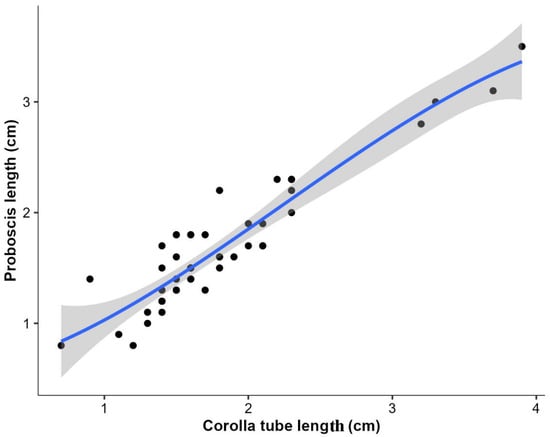 Association between proboscis length of butterflies and corolla tube length of flowers in the National Botanical Garden. Black dots represent the individual data points, and the line is the polynomial regression best-fit line.