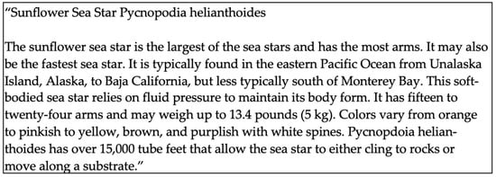 - AZA Sunflower Sea Star. Available online: https://www.aza.org/connect-stories/stories/aza-members-and-sunflower-star-lab-partner-to-help-sunflower-sea-stars (accessed on 16 February 2024).