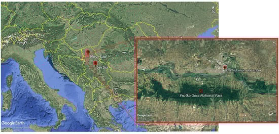 Fruška Gora is an isolated mountain range located mostly in the northern part of Serbia, within the autonomous province of Vojvodina, and geographically positioned between 45°00′ and 45°15′ north latitude and 16°37′ and 18°01′ east longitude (Figure 1). It stretches in an east–west direction between the Danube and Sava rivers, spanning approximately 80 km in length and up to 15 km in width, with the highest peak reaching 539 m. Owing to its exceptionally rich and unique biodiversity, a part of Fruška Gora is under special protection and has been designated as a national park.