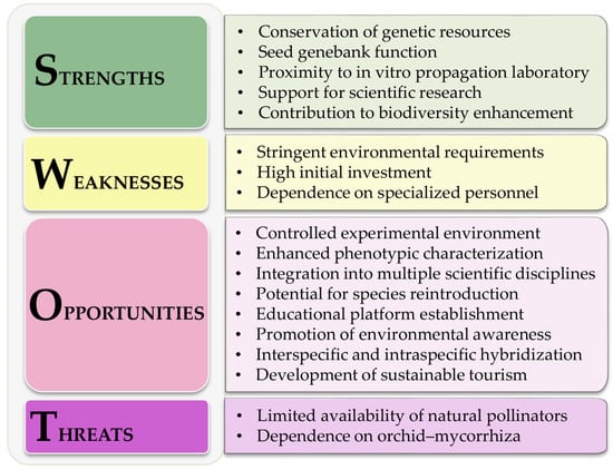 Among the main internal and external negative factors (i.e., weaknesses and threats) that stand out are the high initial investment and the requirement for a specific environment. The establishment of an orchidarium demands substantial financial resources, and the successful cultivation and maintenance of orchid species depend on the availability of trained horticulturists and researchers. Although this is considered a disadvantage, the proximity of the university and the presence of highly educated staff in relevant fields provide favorable conditions for effective facility management. While the establishment of a specialized garden requires high initial investment and a skilled workforce, orchids are known to attract substantial public support. According to Ramsay and Dixon [], the Sainsbury Trust donated GBP 1 million to the Royal Botanic Gardens, in Kew, for the conservation of only one orchid species, Cypripedium calceolus, highlighting the potential for securing significant funding for orchid conservation initiatives.