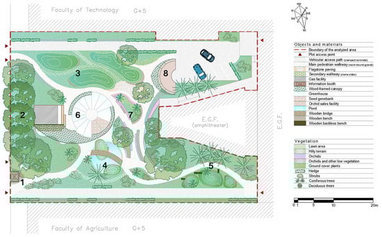 The information on orchid species native to the Fruška Gora region, the results of the SWOT analysis, and the conducted site assessment provided the foundation for developing a functional zoning concept. The design aimed to recreate the natural habitat of selected species while supporting the realization of identified strengths and opportunities, ensuring ecological functionality, social benefit, and economic viability. The area is divided into eight distinct functional zones, through which the main communication routes are defined. These pedestrian routes connect four existing entrance points (two from the surrounding open space and two from the main building) with the designated zones, while also providing two vehicular routes for emergency access. The eight zones are as follows: 1—main entry zone, 2—buffer zone, 3—orchid meadow garden, 4—orchid wetland garden, 5—orchid shadow grove, 6—research and learning hub, 7—orchid display garden, and 8—garden market pavilion (Figure 3).