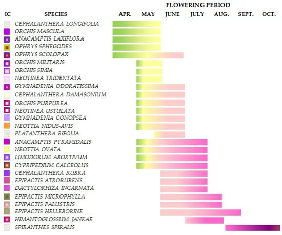 Overview of inflorescence colors and flowering periods of orchid species selected for the orchidarium. IC—inflorescence color (one color is indicated for monochromatic flowers; two colors are shown for multicolored flowers).
