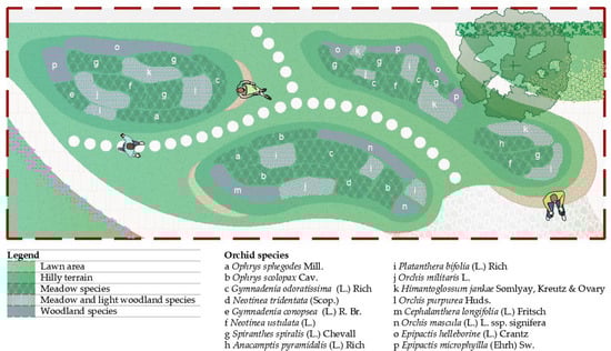 The enclosed character of the selected site allowed for the creation of a space sheltered from strong winds and excessive noise. However, with one side remaining open, the layout required the introduction of plant species to provide effective visual screening, a common practice in landscape design []. The emphasis was placed on blocking outward views from within the site to minimize the perception of surrounding urban elements. The use of the fastigiate form of Carpinus betulus L., in combination with the shrubby forms of Hydrangea arborescens, Ruscus aculeatus, and Cornus alba, ensured effective visual enclosure. An imposing small-leaved linden tree was strategically placed above the main entrance zone, offering shade and a pleasant fragrance during its blooming phase. The decorative and sweetly scented Lonicera climbs the free-standing walls of the information booth, while a composition of shrub forms further enriches the entry area. Orchids from the genera Cephalanthera, Orchis, Limodorum, and Platanthera are planned for the entrance area, with flowering periods extending throughout spring and summer (Figure 6). Interruptions in the vegetative barrier along the western edge of the plot clearly mark two entry points, while unobstructed views from these entrances toward zones 3 and 4 invite visitors to explore the features of the orchidarium. A planting bed of native orchids lines the path from the northwestern entrance, gradually immersing visitors in their rich diversity.