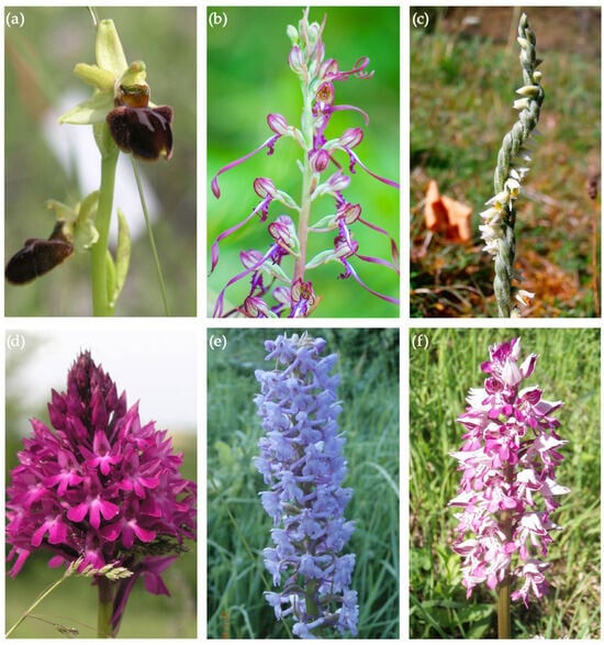 Inflorescence morphology of native orchid species from the Fruška Gora region: (a) Ophrys sphegodes Mill.; (b) Himantoglossum jankae Somlyay, Kreutz & Ovary; (c) Spiranthes spiralis (L.) Chevall.; (d) Anacamptis pyramidalis (L.) Rich.; (e) Gymnadenia conopsea (L.) R. Br.; and (f) Orchis militaris L.