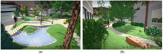 Zones 4 and 5 provide a welcoming environment enriched with visually intriguing companion species, which, in combination with selected terrestrial orchids, stimulate the senses of sight, smell, and touch. This multisensory experience fosters physical sensory engagement, identified by Błaszak et al. [] as one of the three fundamental components of specialized botanical gardens. The fourth zone, the ‘Orchid Wetland Garden’, is encountered when entering the orchidarium from the main entry. It will host species naturally found in weedy meadows and wetlands, including Anacamptis laxiflora, Dactylorhiza incarnata, and Epipactis palustris. These species flower in succession from April to August, with partially overlapping blooming periods, and are distinguished by a palette of purple, white, and pink hues. The design of this garden incorporates a water element to mimic a natural habitat—a pond with integrated small hills (Figure 10a). A wooden bridge extends across the pond, from which visitors can observe orchid species complemented by common wetland plants such as Calamagrostis epigejos, Carex riparia, Equisetum arvense, and Lysimachia nummularia. Winding through the southern edge of the zone, a secondary path bordered by woody and shrubby vegetation connects the main entrance zone to the ‘Orchid Shadow Grove’ (zone 5).