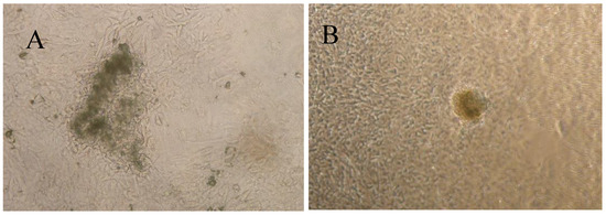 Figure 1. Photomicrography illustrating the colonies obtained using the protocol with PiggyBac transposons. (A) Irregular colony obtained from antler cells (100× magnification). (B) Regular colony obtained from fat cells (40× magnification).
