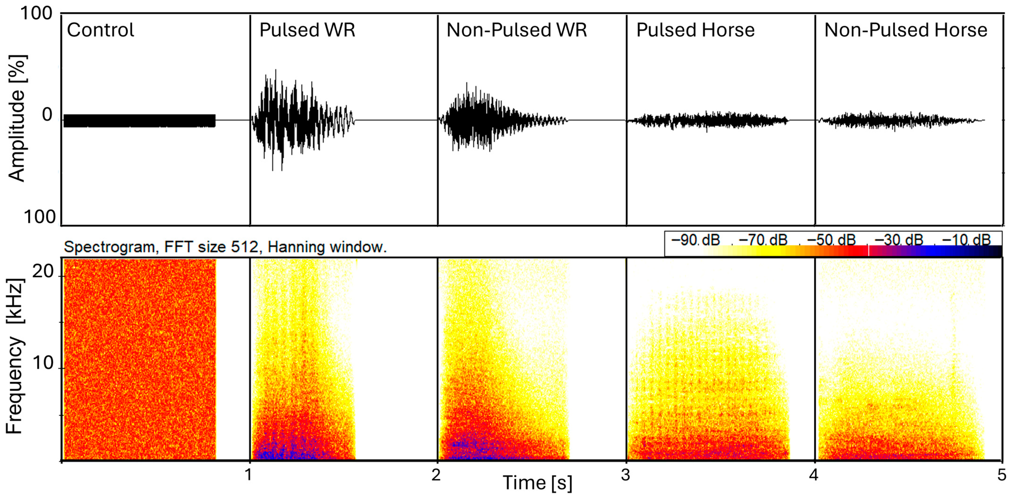 Playback stimuli for white rhinoceros vocalisations were obtained from recordings of previous studies [,,]. Playback stimuli for horses were provided from the Ethology Department at the University of Rennes. All senders were unfamiliar to the study animals. All playback stimuli were prepared using Praat software (version 6.0.52, []). For the snort playbacks (SPBs), five different sets were created, each containing one stimulus per category (a white noise control, a pulsed and non-pulsed conspecific snort of a white rhinoceros, and a pulsed and non-pulsed heterospecific snort of a horse). Single snorts were cut with a duration of approximately 0.83 s (±0.15 s) and ramped by a 0.3 s fade-in ramp at the beginning to prevent abrupt signal truncation by the loudspeaker. The white noise stimulus was synthesised with a length of 0.6 s. Each stimulus consisted of one single presentation of the sound (Figure 1).
