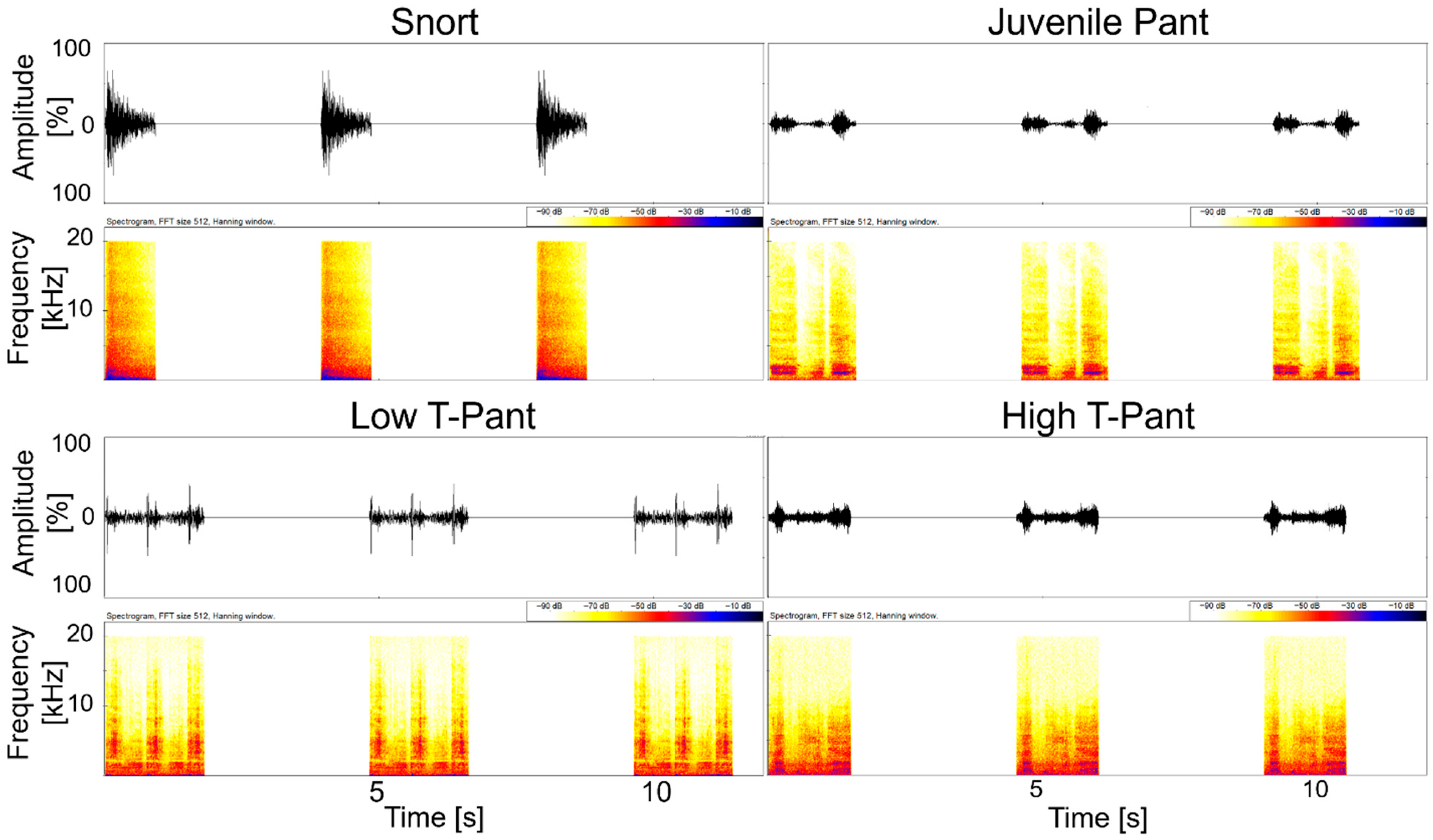 Oscillograms and spectrograms for each of the four stimuli of set 1 of the pant playback. Low T-pant: low testosterone pant; high T-pant: high testosterone pant. Spectrgrams were produced using BatSound Pro (version 3.31, Pettersson Elektronik AB, Uppsala, Sweden; settings: FFT 512, Hanning window).