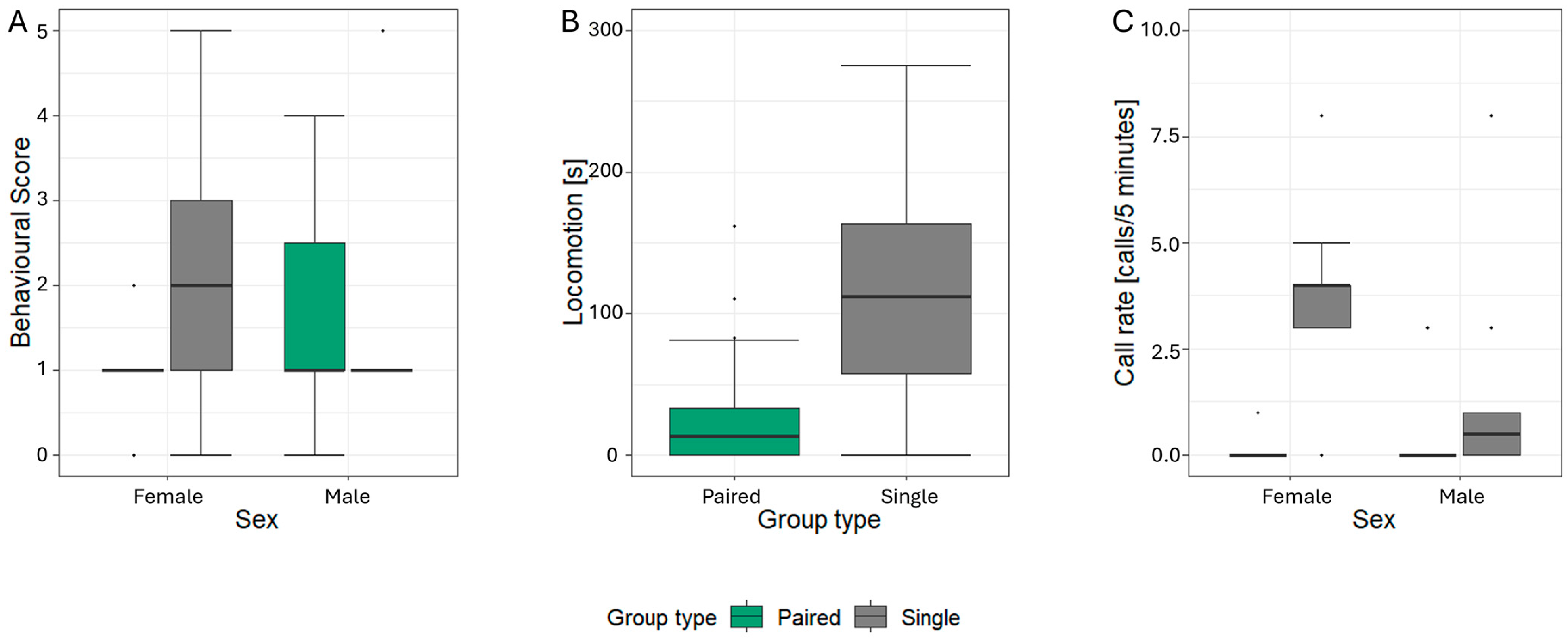 A sex-specific difference was also observed in call rate. However, in contrast to the other behavioural response parameters, it was the females that produced the specific pant vocalisation more frequently than males. This appears to contradict earlier results from Jenikejew et al. [], who reported a higher pant call rate in males. One possible explanation for this discrepancy may lie in the age of the vocalising individuals. In this present study, the most vocal females were subadults or relatively young adults (between five and 14 years), potentially exhibiting greater social motivation or general vocal reactivity. Another relevant factor might be the testing condition: all four of these particularly vocal females were tested alone during the playback trials. It is therefore plausible that the increased pant production reflected attempts to re-establish contact with familiar conspecifics, given that the pant is commonly used as a contact call [,].