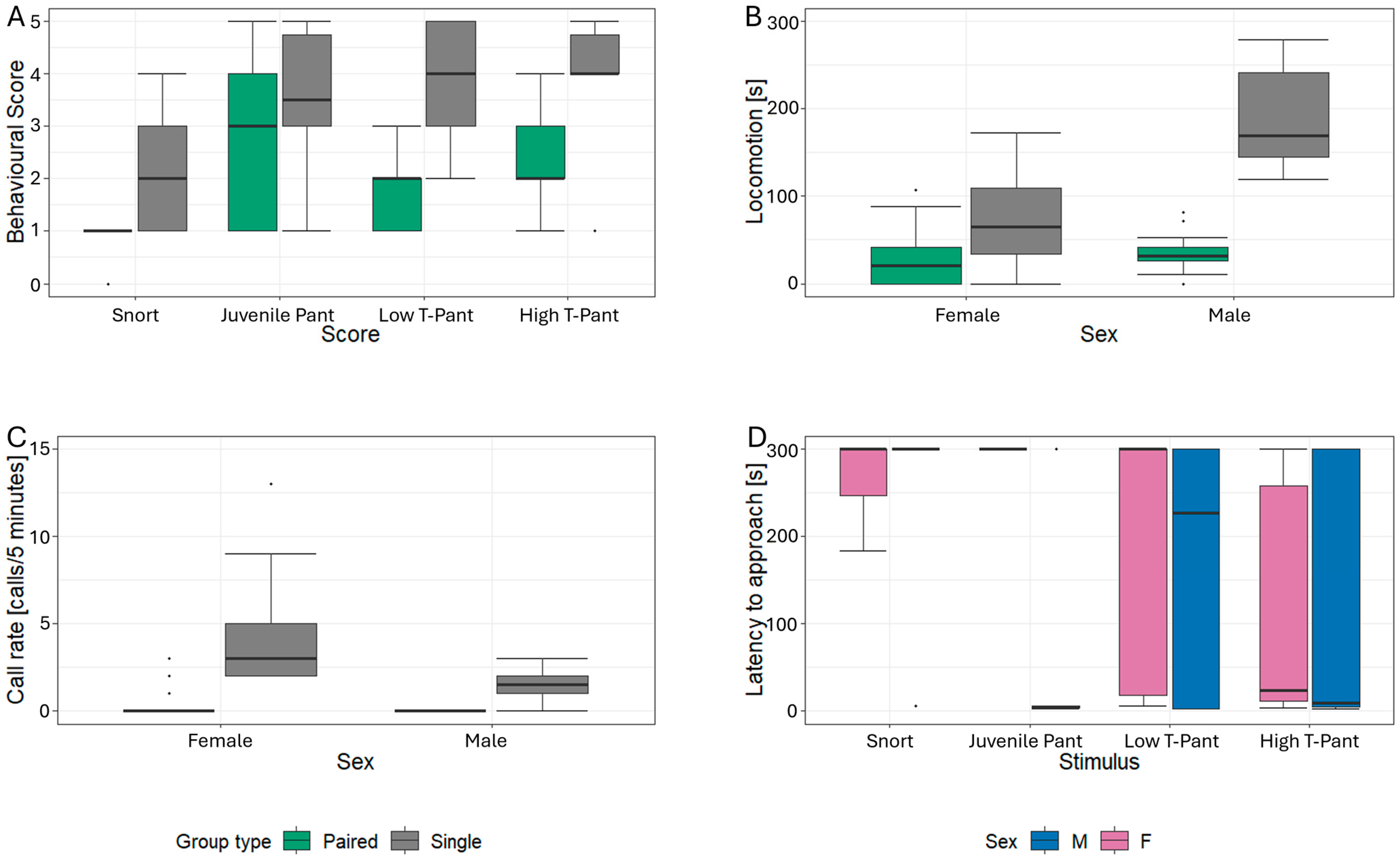 A further consideration is the basis for stimulus selection. The high T- and low T-pant stimuli used in this study were classified solely based on the faecal testosterone metabolite (fTM) concentrations of the senders. On the one hand, it may be that the variation in fTM concentrations in the males available from the previous study (n = 16, []) was not broad enough to cover the range between actually low and high values. On the other hand, it remains unknown whether these hormonal profiles would reliably correspond to truly territorial versus non-territorial males under natural conditions. It is therefore possible that the androgen level differences between the selected stimuli were not sufficiently distinct to elicit clear behavioural discrimination among the receivers.