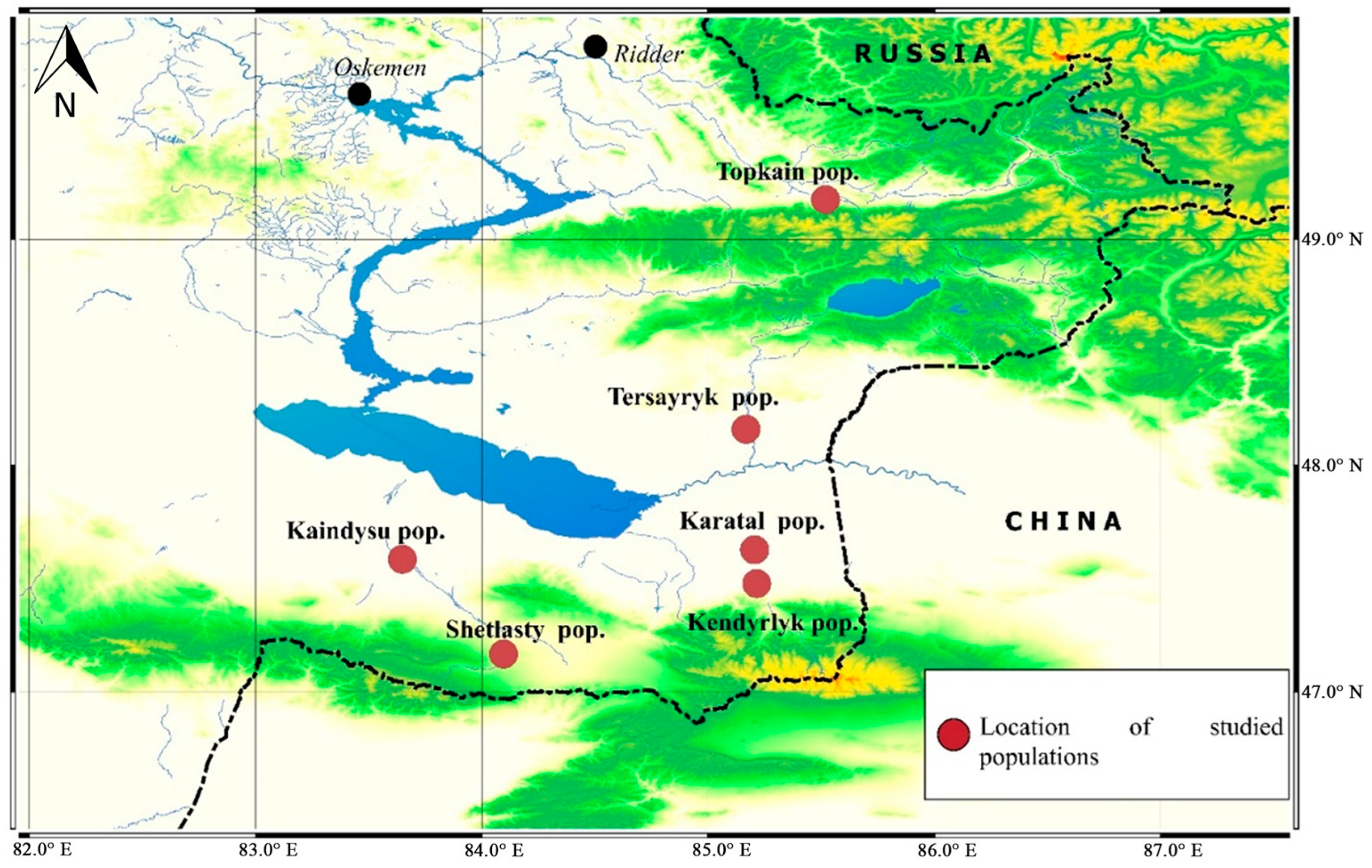 - Almerekova, S.; Yermagambetova, M.; Sumbembayev, A.; Imanbayeva, A.; Turuspekov, Y. DNA barcoding of Hippophae rhamnoides L. collected from natural and introduced populations in Kazakhstan. Eurasian J. Appl. Biotechnol. 2024, 3, 9–19. [Google Scholar] [CrossRef]