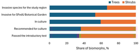 It is advisable to consider the relationship between the invasive potential of tree species and their life form. The predominance of trees over shrubs among invasive species in the region can be linked to the proportion of these life forms in the regional culture, from which they are “runaways” (Figure 3). However, the predominance of trees over shrubs in the group of species invasive to the SFedU Botanical Garden territory (44 tree species, 39 shrub species) cannot be explained by the proportion of these life forms among the species that have passed the introduction test (the number of shrubs is almost three times higher than the number of trees).