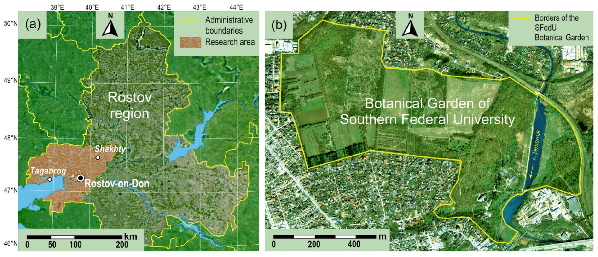 - Kozlovsky, B.L.; Dmitriev, P.A.; Kuropyatnikov, M.V.; Fedorinova, O.I. Woody flora of the Northern city cemetery of the Rostovon-Don city, Russia. Ecosyst. Transform. 2025, 8, 108–122. [Google Scholar] [CrossRef]