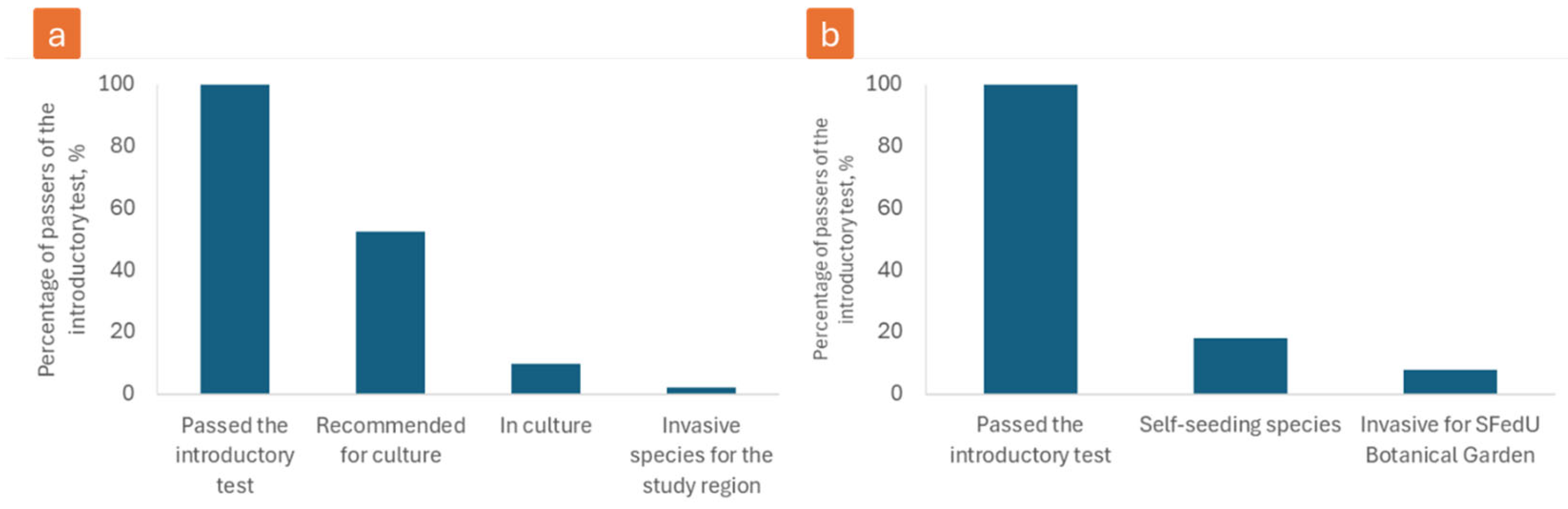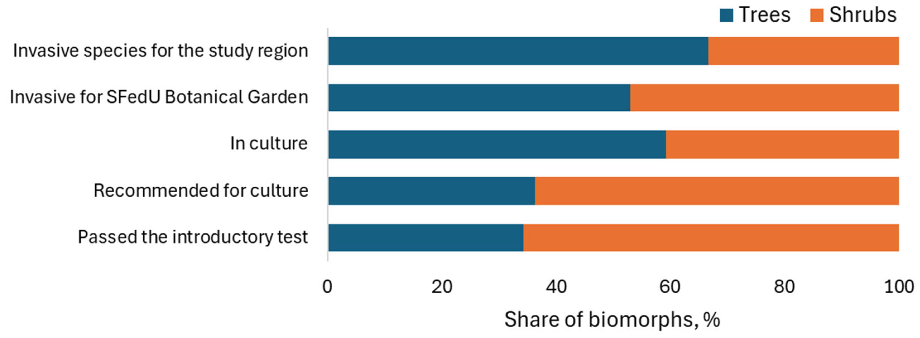 | Natural Range | Species That Have Passed the Introduction Test | Cultivated Species | Invasive Species for SFedU Botanical Garden | Invasive Species for the Region | ||||