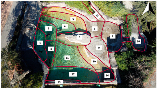 A brief description of each subarea is provided in Table 2 and an aerial photo with labels is provided in Figure 2, from the deepest zones adjacent to the underwater windows (subareas 1–3) to the shallow “beach” areas (subareas 5, 10, 14) and the land sections (subareas 6–9), as well as the indoor facilities (subarea 15) and secondary pool (subarea 16).