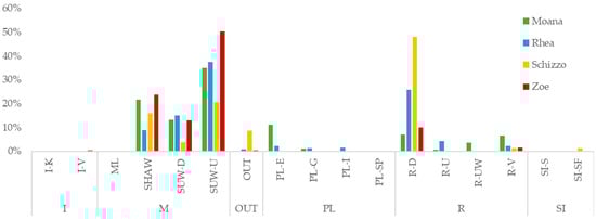 Time budget by behavioral microcategory for the four individuals. Bars show the percentage of observation time allocated to each behavior for Mohana, Rhea, Schizzo, and Zoe. Along the x-axis, codes are grouped by macrocategory (I, M, OUT, PL, R, SI) following the ethogram (Table 3). In general, underwater swimming with belly up (SUW-U) is the predominant behavior for Moana and Rhea; Schizzo devotes a large share to resting with belly down (R-D); Zoe shows a more heterogeneous distribution with notable contributions in SHAW and PL-E. The OUT category is minor for most subjects. Full code definitions are provided in Table 3.