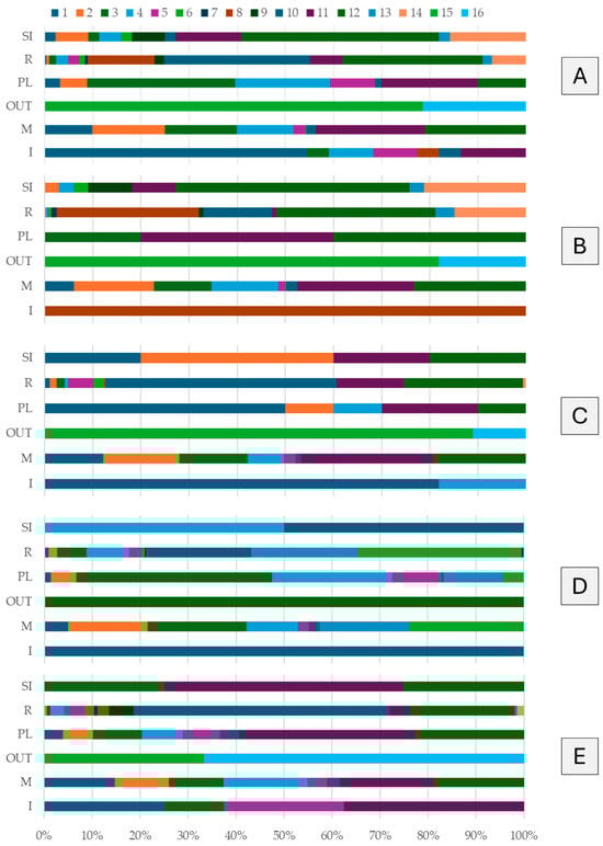 Spatial distribution of behavioral macrocategories across the 16 subareas. For each macrocategory—Interaction (I), Moving (M), Out of view (OUT), Playing (PL), Resting (R), Social Interaction (SI)—the stacked horizontal bar shows the percentage of events/time for that macrocategory occurring in each subarea 1–16; each row sums to 100%. Panels: (A) overall (all individuals), (B) Schizzo, (C) Zoe, (D) Mohana, (E) Rhea. Colors map to subareas as indicated in the legend. Subarea definitions are provided in Table 2, and the exhibit layout is shown in Figure 2.