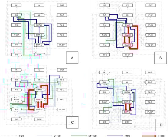 Transition networks among behavioral micro-categories (panels (A–D)). Each node denotes a behavior from the ethogram; directed arrows link the behavior at time t (source) to the next observed behavior (target). Arrow width and color encode transition frequency per legend: dashed grey = 1–20, light blue = 21–50, green = 51–100, dark blue = >100, red = >1000. Nodes are arranged by macrocategory (I, M, OUT, PL, R, SI). Panels: (A) Schizzo, (B) Zoe, (C) Mohana, (D) Rhea. Dashed links mark low-frequency transitions; red arrows highlight dominant pathways. Node labels follow the codes in Table 3; OUT denotes “out of view”.
