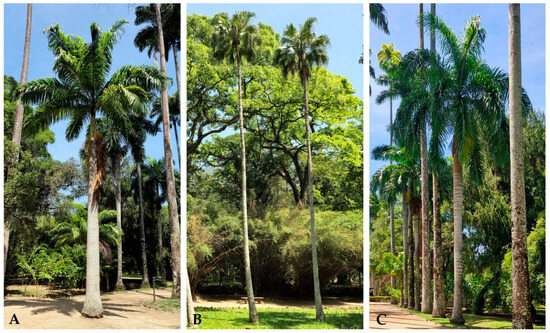- Oliveira, A.R.; Teixeira, M.L.F.; Reis, R. As Palmeiras-Imperiais do Jardim Botânico; Editora Dantes: Rio de Janeiro, Brazil, 2009; 112p. [Google Scholar]