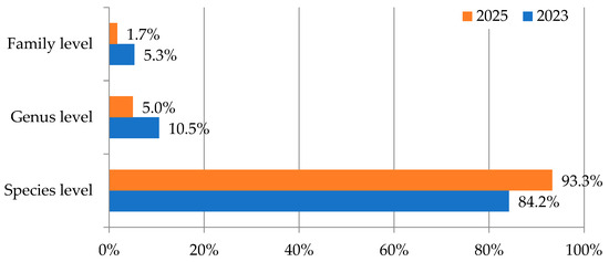 In the 2023 arboretum inventory, considering only the palms cultivated there, 84.2% of the specimens were identified to the species level [21]; following updated identifications, this increased to 93.3%, with 285 specimens receiving improved taxonomic classification (Figure 2).