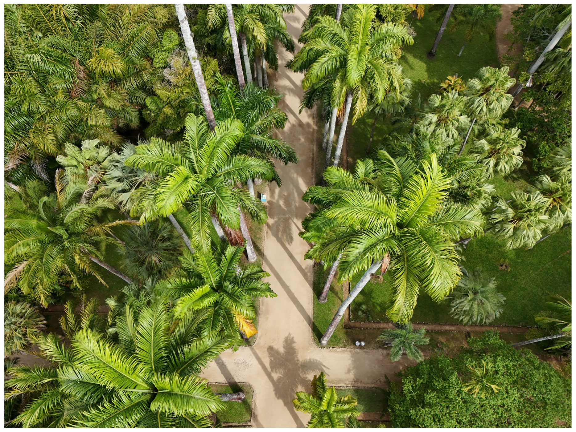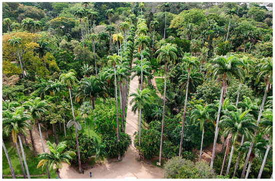 Located within the Atlantic Forest phytogeographic domain, the JBRJ encompasses 38.8 hectares of landscaped gardens, organized into 41 sections comprising 215 beds, with Arecaceae representing the second most species-rich family in the institution’s arboretum [21]. Historically, palms have been central to the living collection, with the royal palm (Roystonea oleracea (Jacq.) O.F.Cook), native to Colombia, Venezuela, and the Caribbean, cultivated since the institution’s second year, now over two centuries ago, and remains the symbolic plant of the garden [22]. Significant collection expansion occurred under Barbosa Rodrigues (director, 1892–1909), who described multiple genera and more than 160 Arecaceae species and published Sertum Palmarum Brasiliensium, a foundational work in South American palm taxonomy [23,24]. Between 1930 and 1960, historical data show that approximately 400 specimens were introduced from countries such as the USA, Chile, Mexico, Cuba, Italy, and Costa Rica.