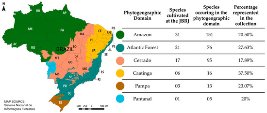 Diversity of native palm species cultivated in the collection at the JBRJ, their phytogeographic domains of occurrence, and the percentage represented in the collection [5,32].
