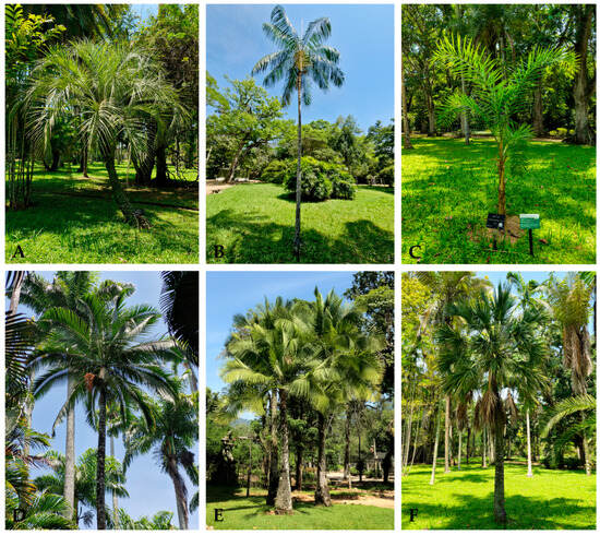 Palms of the family Arecaceae exhibit a broad geographic distribution, with the highest species richness in tropical regions. They play a crucial ecological role due to their productivity and diverse uses, including food, wax production, raw materials for hygiene products, cosmetics, and medicinal applications, as well as socio-cultural and economic significance for local communities [1,2]. The family comprises 190 genera and 2715 species globally [3]. Unfortunately, habitat destruction, climate change, and commercial exploitation have placed more than 1000 palm species at varying levels of extinction risk [4]. In Brazil, 37 genera and approximately 300 species are considered native, with 19 species considered threatened [5,6].