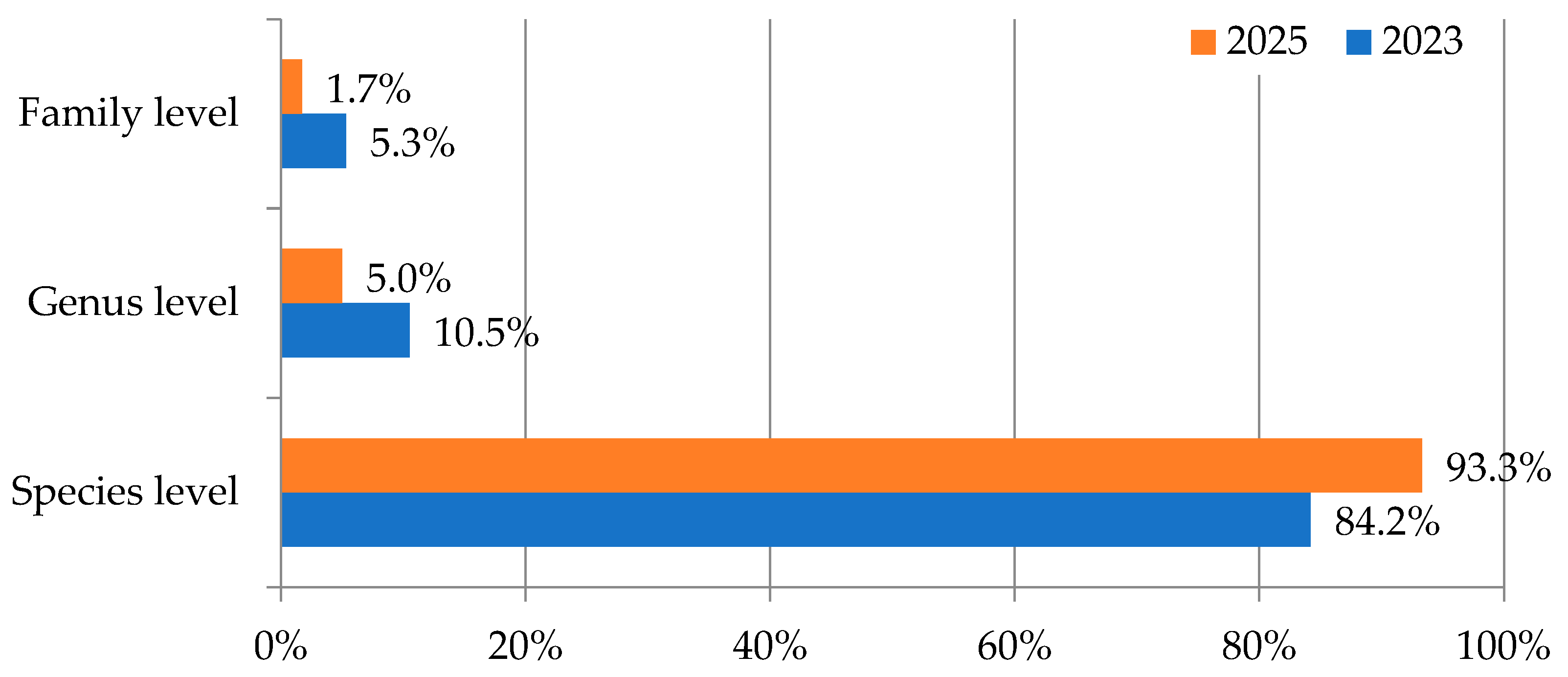 Figure 2. Comparison of taxonomic identification levels in the Arecaceae collection before and after this study.