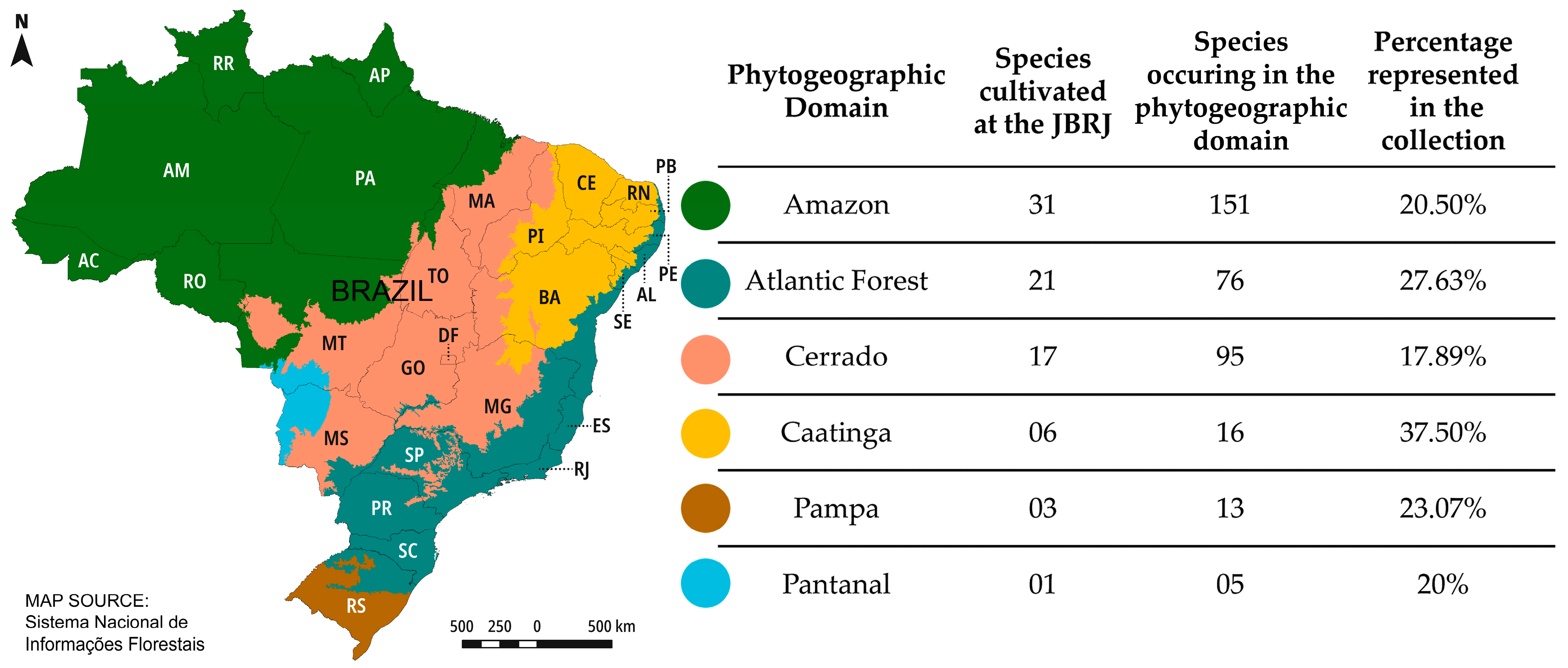 Figure 4. Diversity of native palm species cultivated in the collection at the JBRJ, their phytogeographic domains of occurrence, and the percentage represented in the collection [5,32].