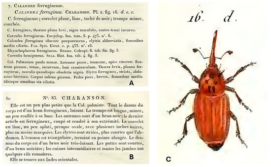 Description and image of Rhynchophorus ferrugineus. (A). Page 79 of the 5th volume of the Entomologie (Entomology) by A.G. Olivier in 1807 [2]. (B). Page 80 of the 5th volume of the Entomologie by A.G. Olivier in 1807 [2]. (C). Plate 2 corresponding to the 83rd genus (Charanson) in the 8th volume of the Entomologie by A.G. Olivier in 1808 [3].