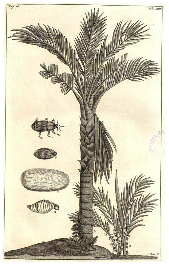 The earliest known record of this weevil species dates back to observations by Georg Eberhard Rumpf (1627–1702) in the late 17th century and published posthumously in 1741 and in a reimpression in 1750, likely on the sago palm, Metroxylon sagu, in Amboina (modern-day Indonesia) (Figure 2) [5,9,10].