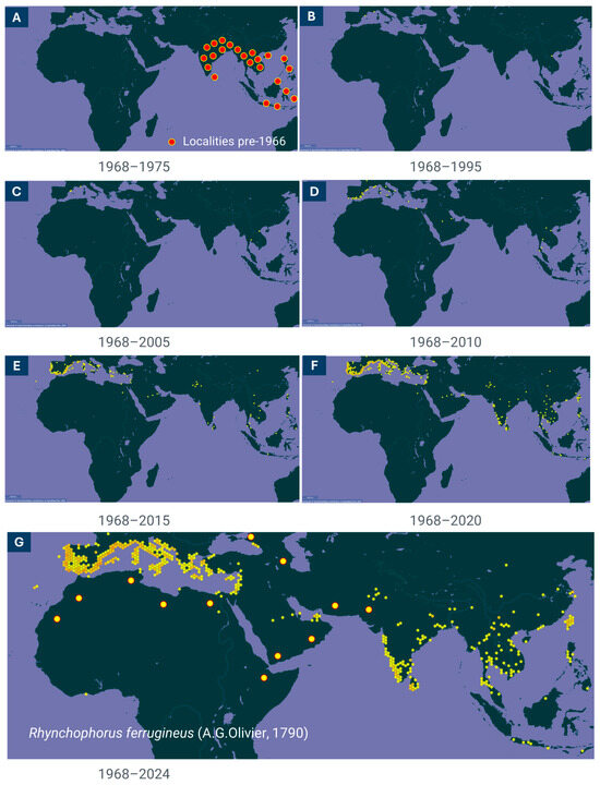 Chronology of the geographic expansion of Rhynchophorus ferrugineus (RPW) during the latter half of the 20th century. Cumulative distribution maps were generated using primary data sourced from GBIF [13], where the dots change from yellow to various shades of orange depending on the increasing number of records they represent. Due to gaps in the GBIF dataset, supplementary information was incorporated to ensure accuracy. In panel (A), red dots indicate regions and dates not recorded in GBIF, derived from additional sources. In panels (B,C), to 1995 and 2005, respectively the increasing number of localities is represented in terms of yellow dots. In panels (D–F), to 2010, 2015 and 2020, respectively, the increasing number of records is representd in terms of yellow dots number but where the localities are closer at the scale of the map this is represented in shades of orange. In panel (G), to 2024, were added large yellow dots with red margins to represent countries reported by EPPO [14,15] but absent from the GBIF database [13].