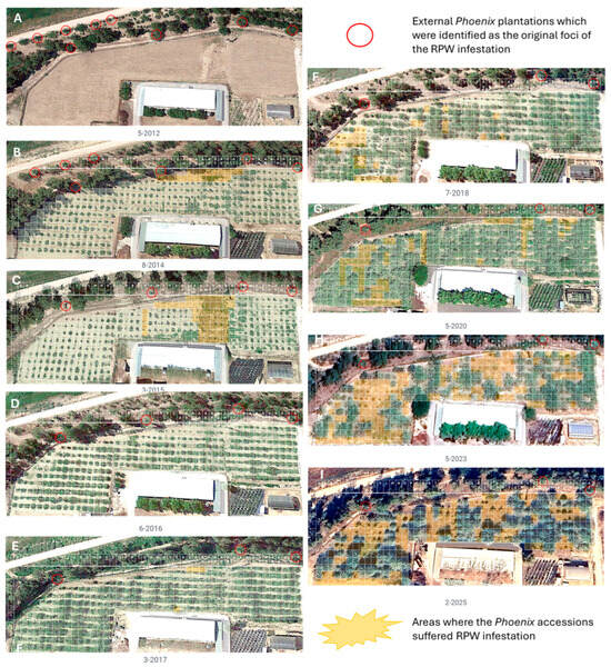 Since 2012, systematic monitoring of RPW infestation has been conducted at two sites housing the National Phoenix Collection (Spanish date palm and related species). At the EPSO site, where plot re-layout commenced in 2012, monitoring has employed a dual methodology: Google Earth imagery analysis (Figure 5) to identify infestation patterns, origins, and successive waves of attack, complemented by ground-based plant-by-plant field inventories (summarized in Table 1). This integrated approach has enabled documentation of the escalating annual impact and subsequent replanting efforts to fill gaps left by palm mortality (Figure 5).