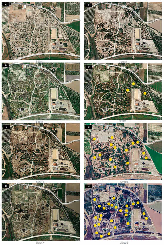 Chronology of the Phoenix plantation at the Palmetum in Soto I6 (Orihuela) and of the impact of the RPW infestation. During years 2014 to 2017 the park suffered severe drought and failed irrigation which led to de death of 55 accessions, but without evidence of RPW presence. Orange-yellowish dots represent zones where at least one palm died infested by RPW. Subfigures: (A) Image of the park prior to the planting of the accessions. (B) Image taken after the first planting phase in 2014. (C,D) Loss due to irrigation failure of most of the palm trees planted in the first phase. (E) Second planting phase in 2018. (F–H) Evolution of RPW infestation since 2021. Infestation seems to have its origin in the EDAR zone (see (F)).