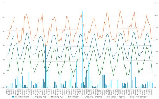 Monthly maximum, mean, and minimum temperatures, and precipitation for years 2014 to 2024, the period during which Phoenix plantings were conducted and the impact of Rhynchophorus spp. was monitored. Coordinates: The x-axis (abscissa) denotes the months of the period under consideration. The left y-axis (ordinate) represents the average monthly temperatures in degrees Celsius (°C), while the right y-axis indicates the monthly precipitation in liters per square meter (L/m2) or millimeters (mm). Climatic conditions are relevant because they influence the development and spread of the red palm weevil. Data were obtained from the AEMET Orihuela station (Code 7244X; 26 m a.s.l.; 38°04′04″ N, 0°58′53″ W).