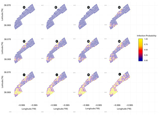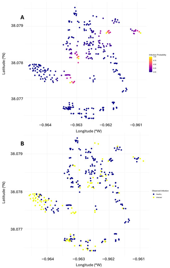 Parameter estimation employed maximum likelihood optimization. For each palm at each census, log-likelihood contributions were calculated as log(pi) for infested plants and log(1 − pi) for non-infested plants. The negative log-likelihood was summed across all plants and census periods, with optimization seeking the α value minimizing this quantity. Higher α values indicate short-range transmission dynamics, while lower values suggest long-distance dispersal capacity.