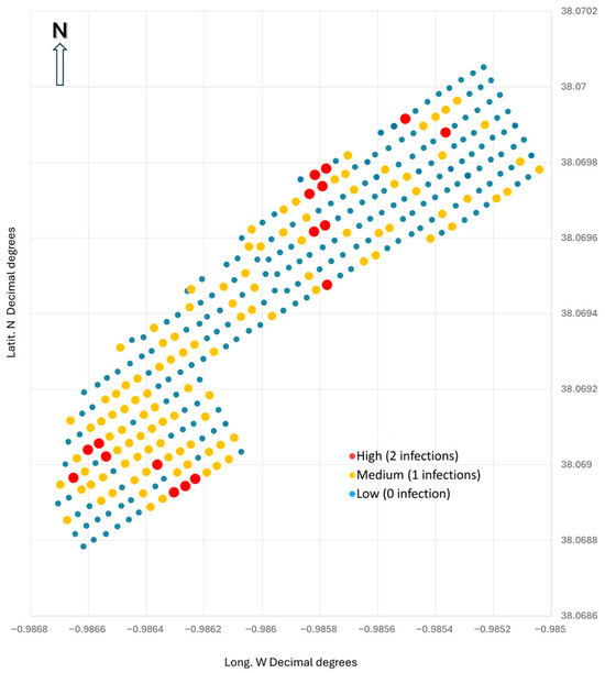 The treatment of Rhynchophorus in the Historic Palm Grove of Orihuela in 2018 consisted in interventions that commenced on Monday, 13 August, involving the treatment of 4333 specimens with the insecticide Thiametoxam (commercial name Actara 25 WG, Syngenta España S.A.U., Madrid, Spain). This chemical treatment complements the biological control methods previously applied during pruning operations and inflorescence removal, which included the application of Beauveria bassiana [30].