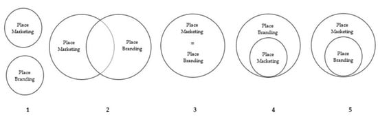 Various approaches to locating place marketing and place branding. (1) place marketing and place branding are separate and distinct constructs; (2) place marketing and place branding are separate constructs but can overlap; (3) place marketing = place branding; (4) lace marketing is part of place branding; (5) place branding is part of place marketing.