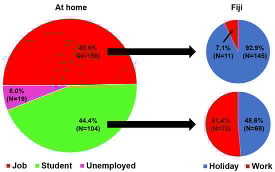 Of the sample (N = 333), 44.4% reported being students at home, 6.0% reported being unemployed, and 49.6% reported having a job at home. The majority of subjects were in Fiji for holiday (N = 246, 73.9%), while about a quarter of the sample was in Fiji to work (N = 87, 26.1%) (See Figure 2).