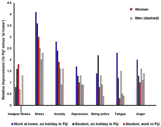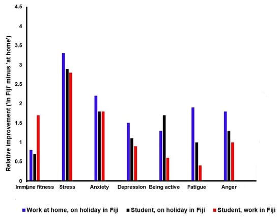 The current study suggests that having a holiday in Fiji is associated with significantly improved perceived immune fitness (+14.3%) and significantly reduced stress (−62.5%). These observations were accompanied by significantly improved other mood ratings while in Fiji. The improvements were seen both in a working population and a student sample in Fiji for a holiday. Having a holiday or working in Fiji significantly improved immune fitness and mood. The reported improvements in immune fitness were most pronounced for female students on holiday in Fiji (+27.9%), whereas the improvements in mood were largest among working women on holiday in Fiji. Students who came to Fiji for work reported significantly higher levels of fatigue than students and people with a job at home that were on holiday in Fiji. They were also more active than holidaymakers. The improvements observed in perceived immune fitness and stress were significantly associated with the number of days being in Fiji. Interestingly, the improvements were not significantly associated with the total number of days being abroad, suggesting that specific environmental characteristics of Fiji may have contributed to the reported improvements. Further research should investigate these currently unknown social, cultural, and environment factors that make Fiji different from other countries in terms of generating positive health effects. A direct comparison with other holiday destinations is therefore warranted. It is important to rule out a possible impact of socioeconomic inequalities [], because it may depend on socioeconomic status and country of origin if one can afford having a holiday in Fiji.
