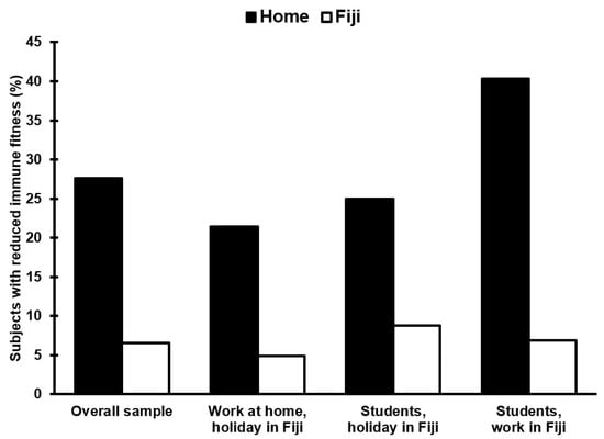 Finally, Figure 4 shown the percentages of subjects that have reduced immune fitness (scores below 6) for the different populations in Fiji. Significant reductions in percentages of subjects with reduced immune fitness were observed for all subgroups visiting Fiji when compared to at home (p < 0.0001). For the population as a whole, the percentage of subjects with reduced immune fitness was 27.6% at home versus 6.6% in Fiji. The highest percentage of subjects having reduced immune fitness at home was found among students who came to Fiji for work (40.3%). This subsample also showed the largest reduction in percentage of subject having reduced immune fitness (Fiji minus home). The lowest percentage of reduced immune fitness in Fiji was found among working subjects on holiday in Fiji (4.9%).
