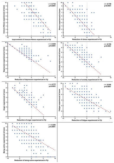 Impact of “at home” ratings on perceived immune fitness and mood in Fiji. Bivariate correlations between “at home” ratings and changes of perceived immune fitness and mood (change score = “at home” minus “in Fiji”) are presented. Negative scores on the X-axis present an improvement in the rating relative to “at home.” Higher scores “at home” are associated with greater reductions “in Fiji.” Red lines represent Spearman’s rho correlations. All correlations were statistically significant (p < 0.0001).